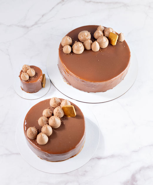 Bolo mousse cremoso e com dulçor equilibrado. Base de bolo de cacau, recheio de ganache cremosa de café e mousse de amêndoas. Coberto com uma glaçagem espelhada e decorado com cacau e amêndoas.