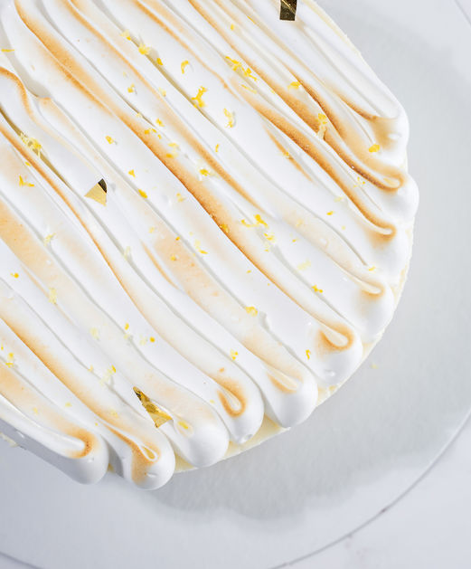 Uma torta fresquinha e leve. Base de amendoas sem glúten, uma camada de curd de limão siciliano bem cítrico e uma mousse de limão com chocolate branco. Coberta com merengue suiço. Um sabor equilibrado, doce e cítrico.